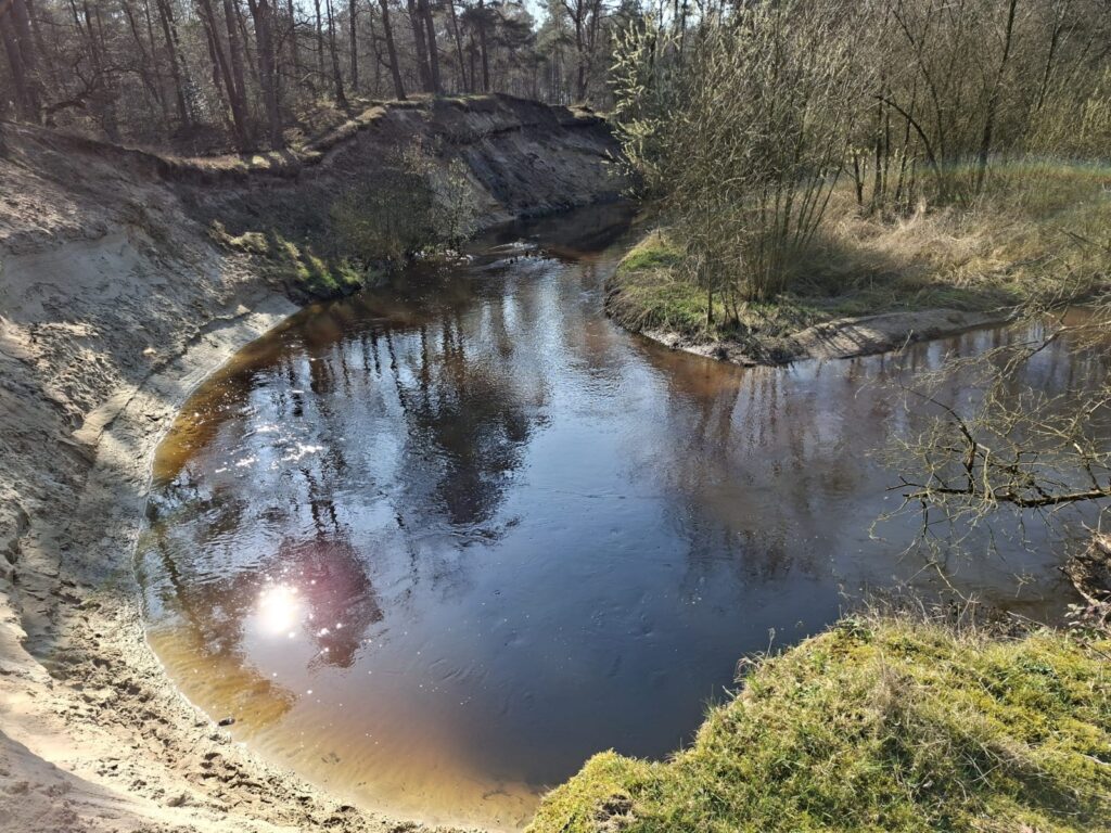 Maar na nog geen kilometer diende het eerste obstakel zich al aan, waarbij het riviertje helemaal geblokkeerd was en we er linksom of rechtsom over land langs moesten zien te komen. Dat lukte gelukkig vrij goed, en al snel zaten we allemaal weer in de boot. Ik vroeg me toen wel af wat we verder nog allemaal tegen zouden komen, maar uiteindelijk bleek dit ook de enige blokkade van de hele tocht te zijn; we kwamen wel veel obstakels tegen, maar er was altijd wel een gaatje waar we wel door konden. Na 8 prachtige kilometers met 2 reeën, eindeloos veel bochten, goed opletten, veel sturen en zo af en toe even hard werken was er de eerste stop op een bankje in de zon, en na 17 km op het Lutterzand de tweede. Op papier leek die tweede stop, met nog maar 3 kilometer te gaan, misschien niet nodig maar het was een prachtige plek om te stoppen en die laatste paar kilometers bleken door de vele bochten nog even aardig wat concentratie en stuurmanskunsten te vragen. Uiteindelijk waren we om 15:30 op het eindpunt, en waren we om 17:30 weer terug bij Njord. Een mooie dag met een prachtige uitdagende tocht in heerlijk weer; wat wil je nog meer? Foto’s zie fotomap deze site https://www.lkv-njord.nl/fotos/nggallery/album/dinkel-maart-2026-5